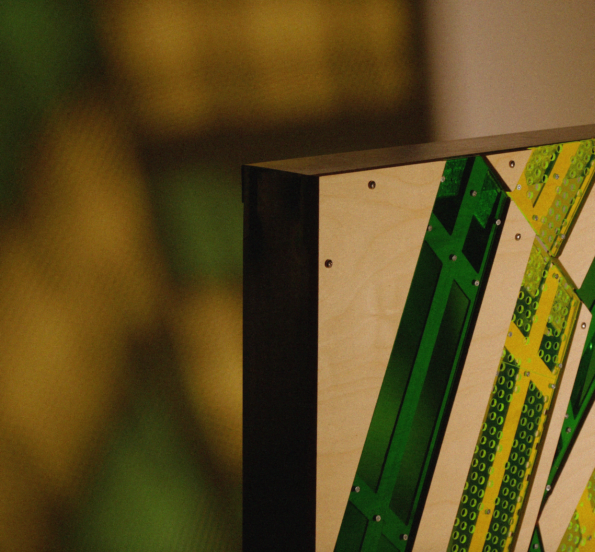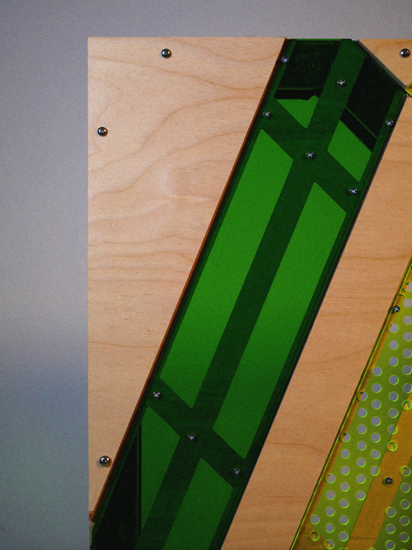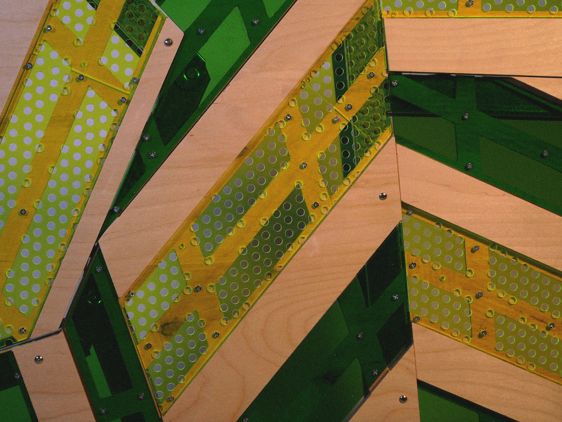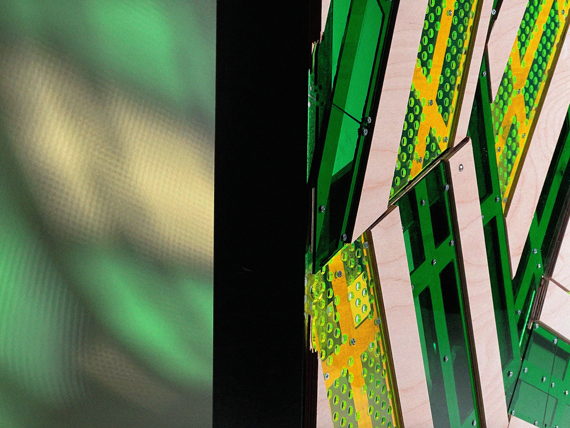 1m x 1m ; birch plywood, green acrylic, steel frame.