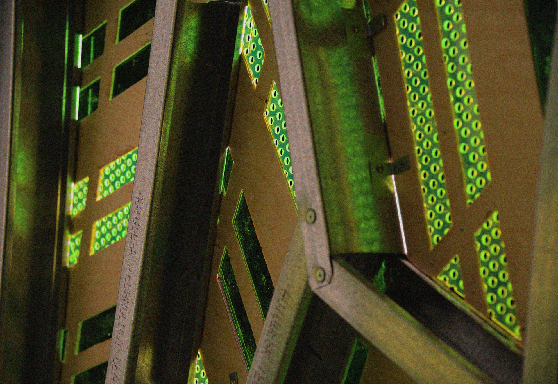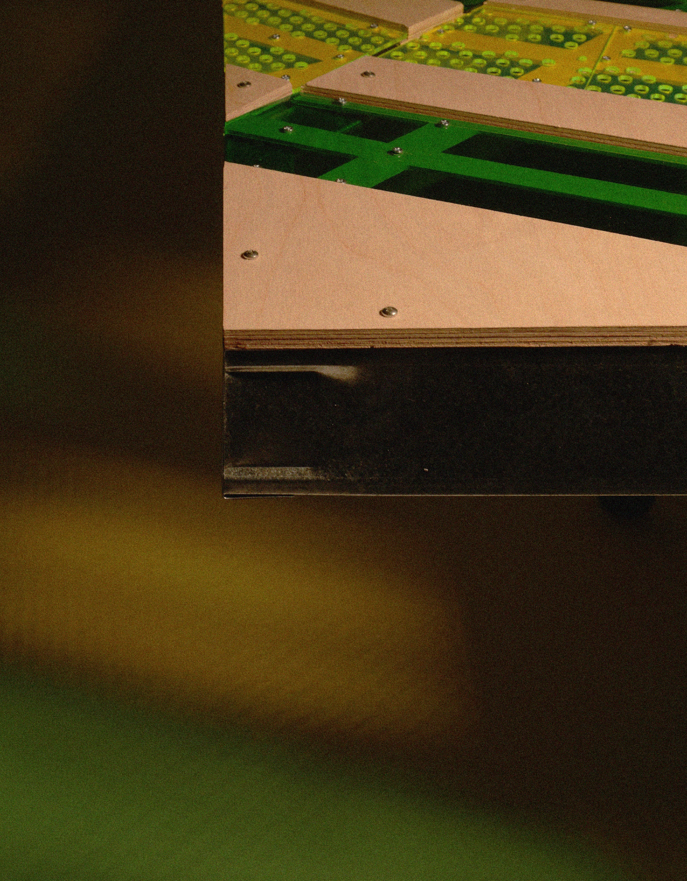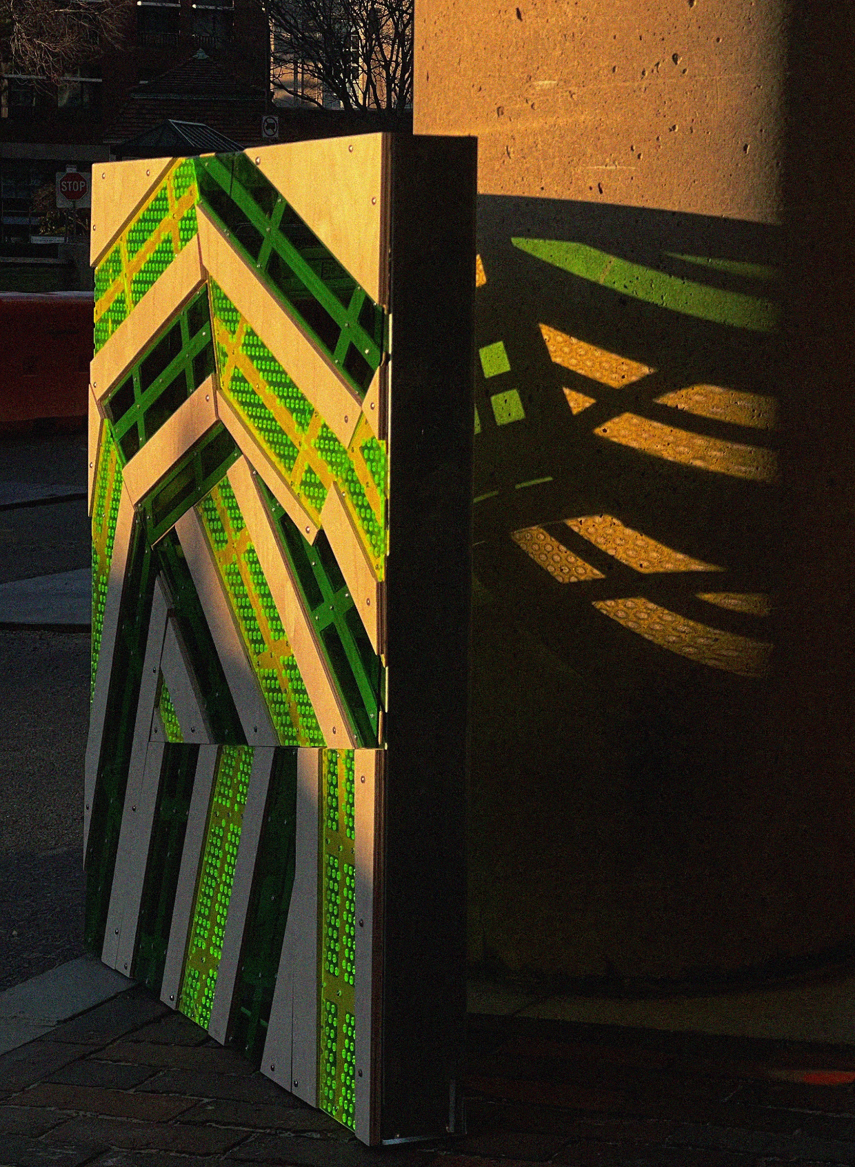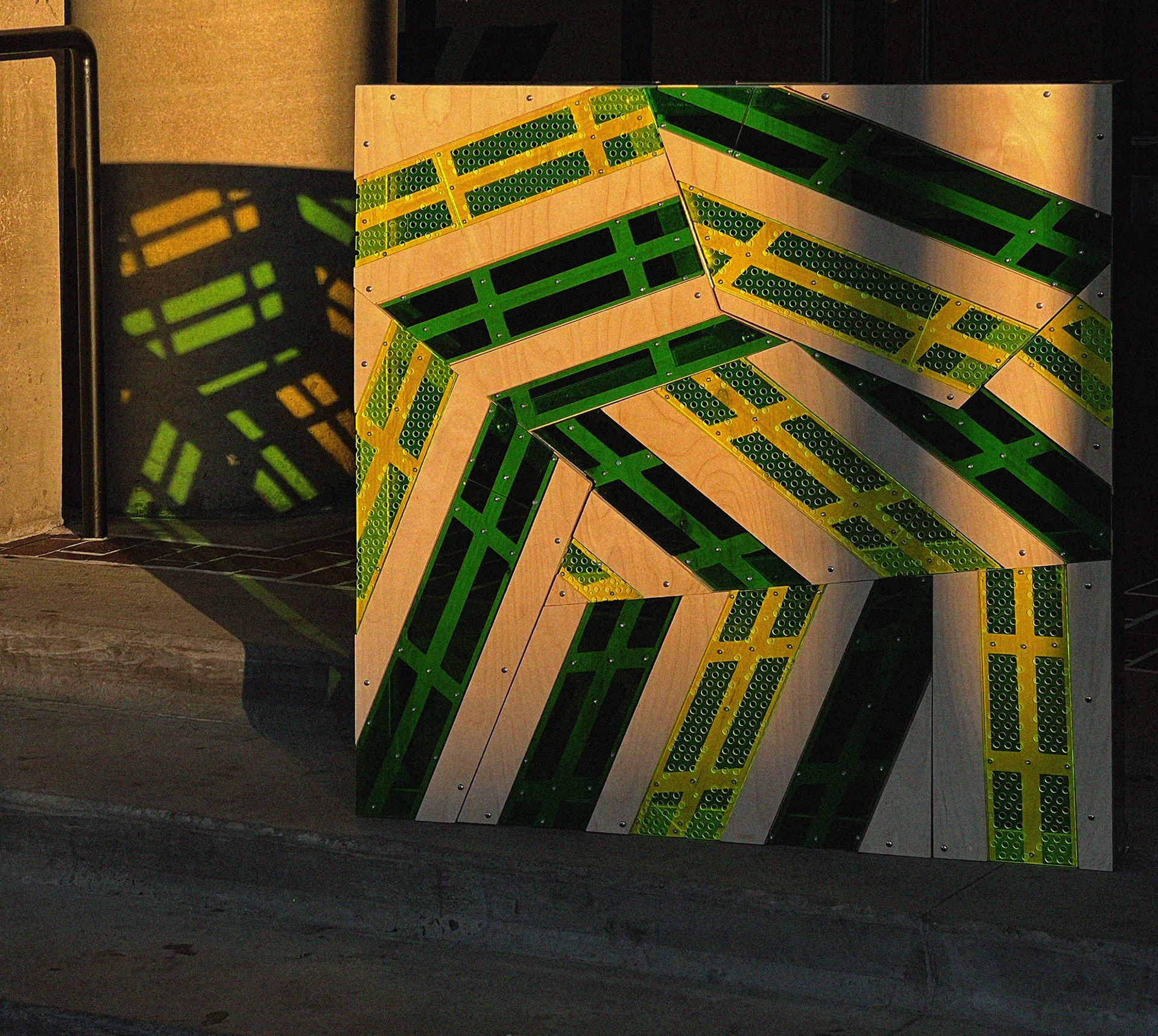 1m x 1m ; birch plywood, green acrylic, steel frame.