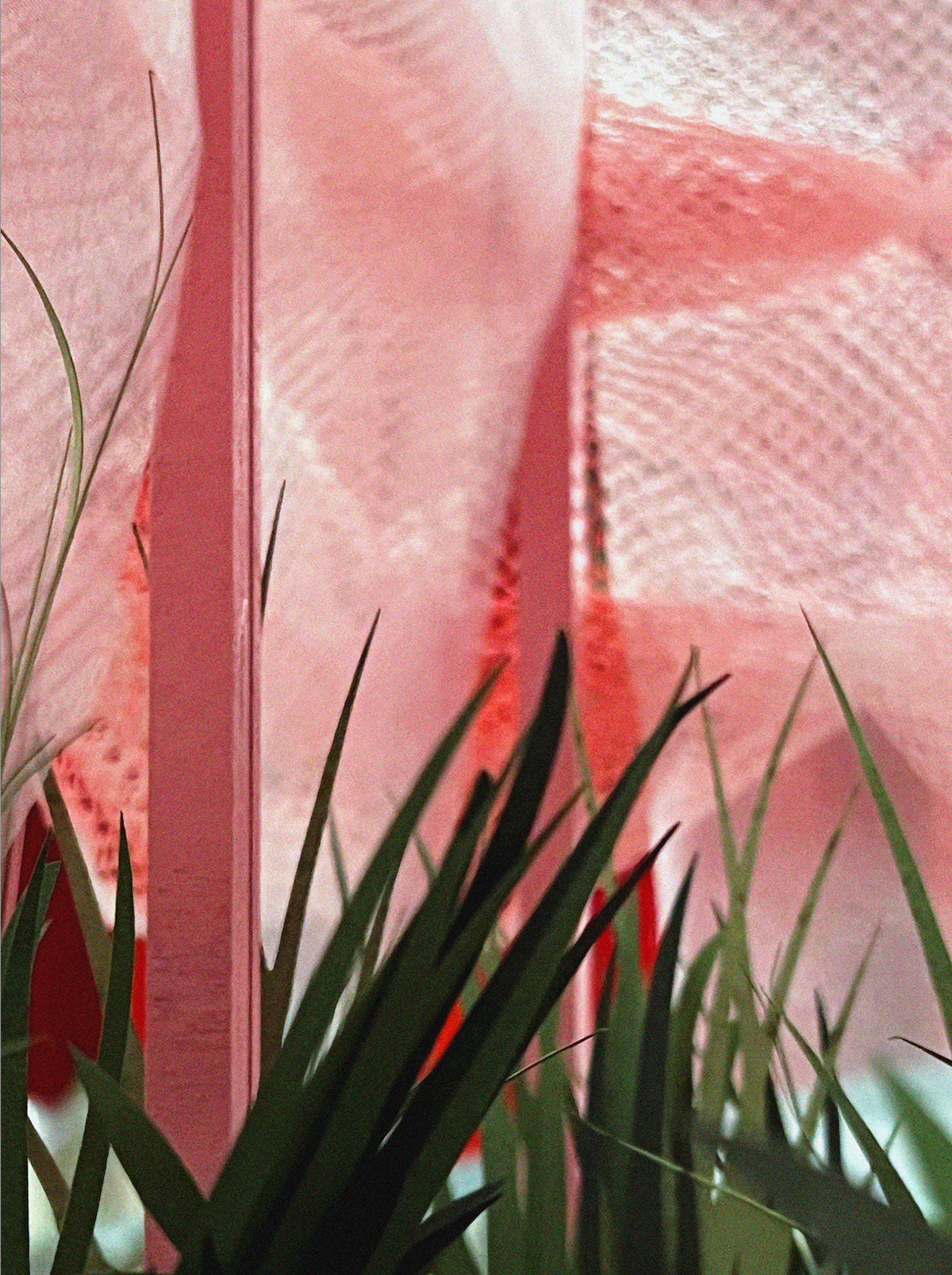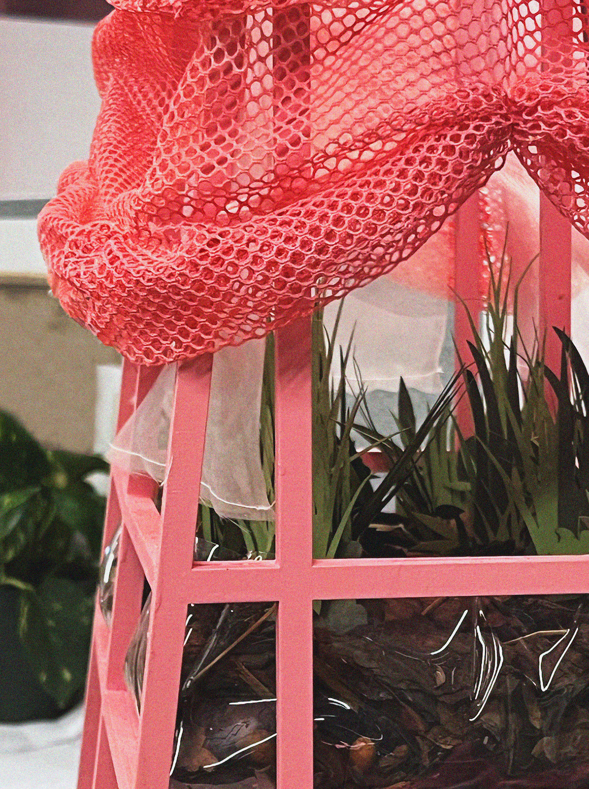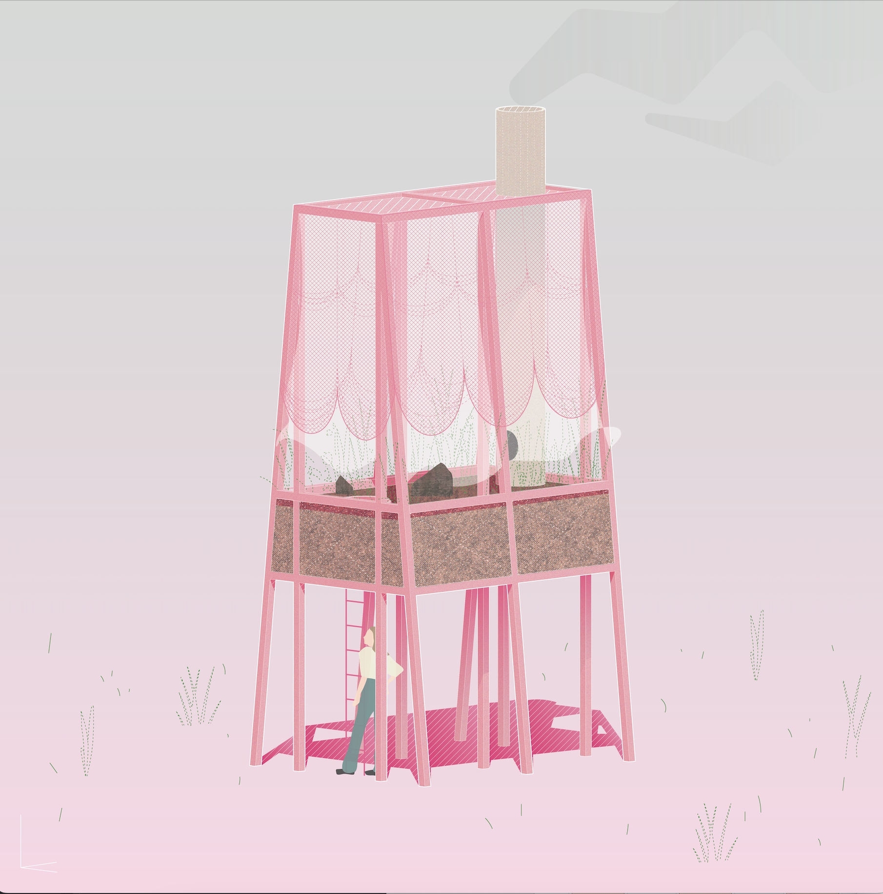 Raised tea garden pavilion. PTFE panels, chainmail gathers, and pink-powder-coat steel channel.